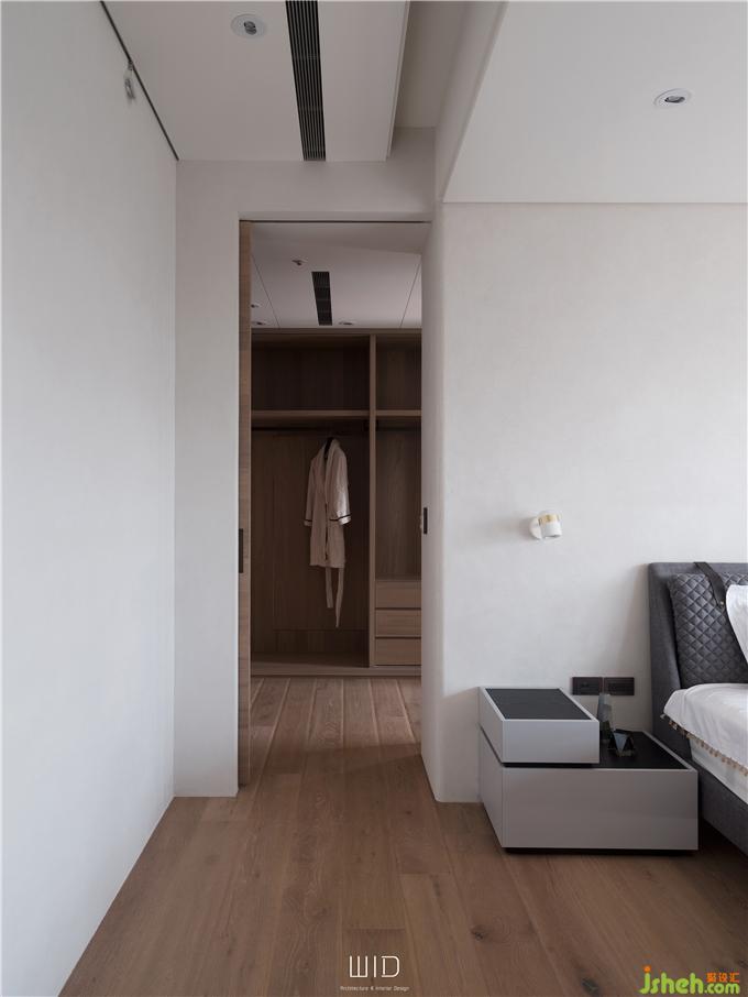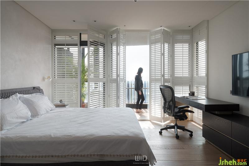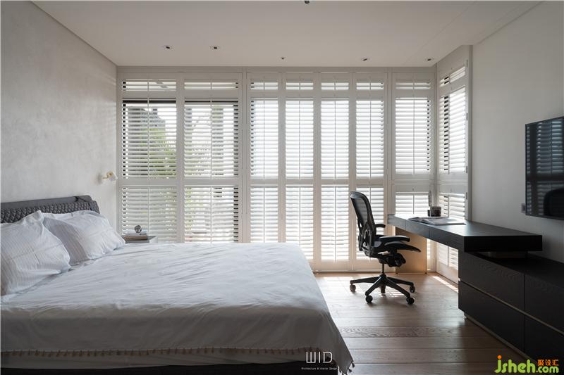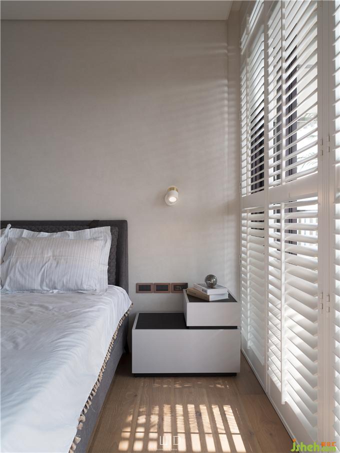 隨手拿本好書搭配著手沖咖啡,到戶外曬曬太陽,都是生活日常。我們使用了百葉窗,天氣好的時候可以全部收折起來,讓室內室外合而為一,將窗戶關上,也一樣有著落地窗的采光與穿透。延伸「白色系」的百葉,將舒適的感覺帶進臥室搭配窗外的景和植物,愜意又放松。主臥陽臺聯(lián)通客廳,在空間中可以隨性的走動、停留,場域之間沒有隔閡。面長的書桌結合收納功能,運用高低落差增加層次感,木質的顏色內斂沉穩(wěn),可以安定人心。觸摸墻面各個角度的弧度、質感,在光影之間的輕微碰撞中傾聽清脆悅耳的聲響,跟著線條一起走進了更衣室。