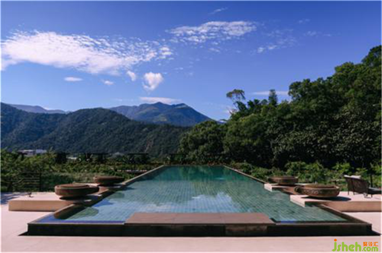 山巔之處無(wú)邊界泳池,設(shè)計(jì)像懸浮在樹(shù)梢上,池水透過(guò)石磨造型注水器緩緩流下,如同藝術(shù)品一般。容納著流水與光景,在這里遠(yuǎn)離了人聲鼎沸,隨處可見(jiàn)能躺平的休閒椅,上聞見(jiàn)高山遠(yuǎn)樹(shù)、絲絲安逸靜美的氣息。酒店設(shè)計(jì)