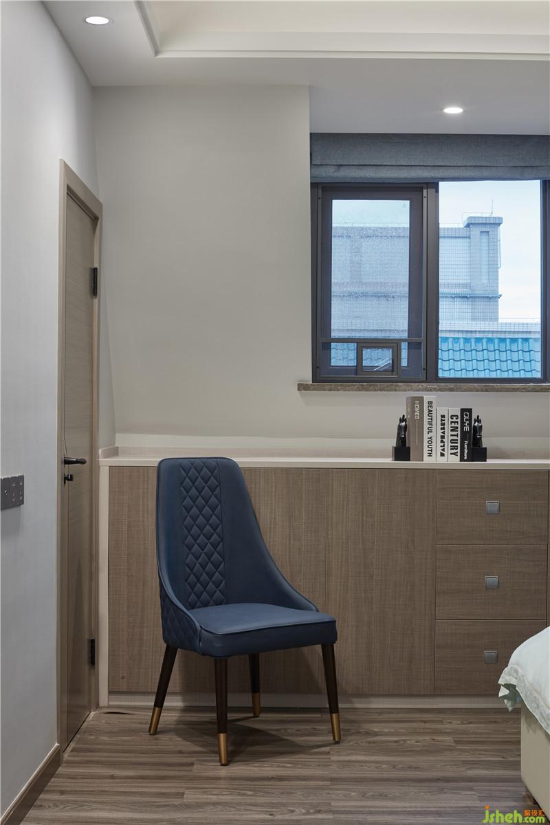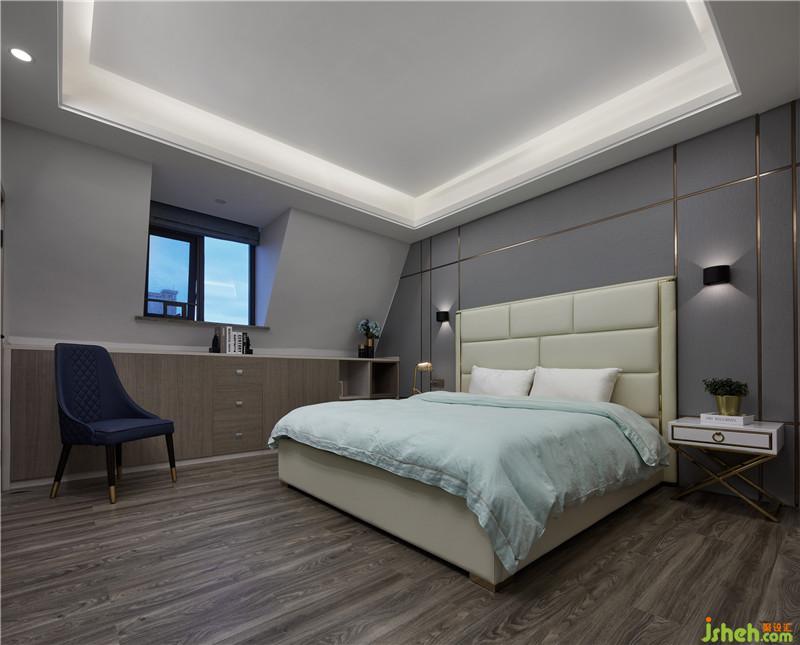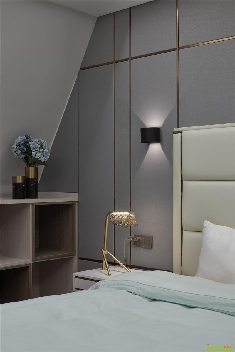背景墻由灰色硬包加金屬條鋪陳,營造現(xiàn)代氛圍,在床頭壁燈的呵護下,以柔和被褥作映襯,渲染一種親和淳樸、安享自身的人生態(tài)度。