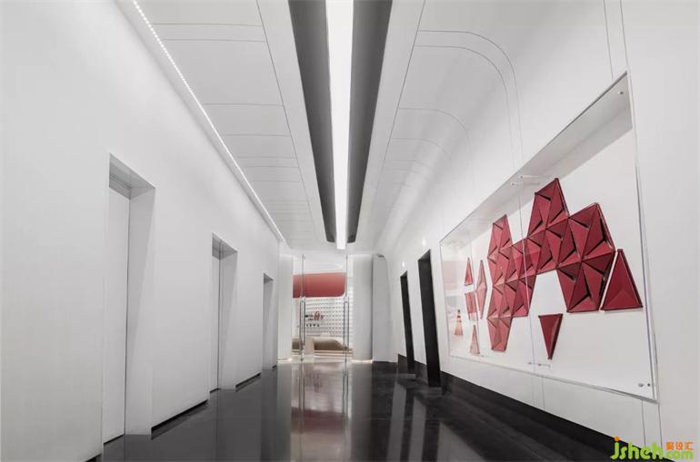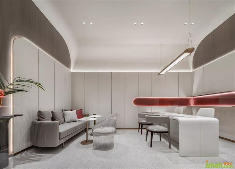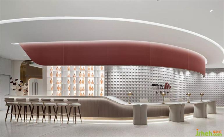 天津,因水而行的城市。水,讓城市充滿靈性,如同流動水系般的造型天花在大面積乳白色的襯托下加入金屬光澤,如繁星點點照亮整個空間。會員中心設(shè)計整體色調(diào)以淡雅灰與優(yōu)雅紅為主調(diào),柔和的弧形曲線,將動態(tài)流動感展現(xiàn),金屬的細(xì)節(jié)點綴,烘托流光溢彩的氛圍。