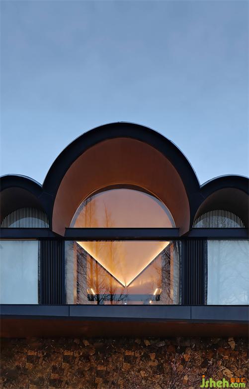 一方浮島,枯木幾棵,恣意伸展之間如同迎接,細(xì)述著時間的過往。酒店建筑與周遭的自然景觀融為一體。酒店設(shè)計高低錯落的圓拱形屋頂形成聚落,如同山峰迭起的水岸邊??康乃宜掖啊?