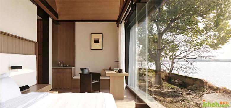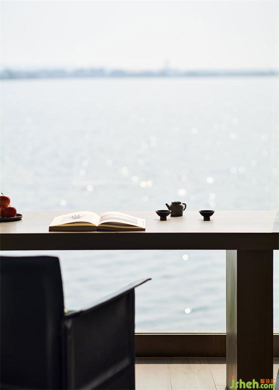 The room facing the riverbank offers a panoramic view of the waterfront. Leaning over the long case, people can enjoy the sunset with the shadow of trees and the light of waves.