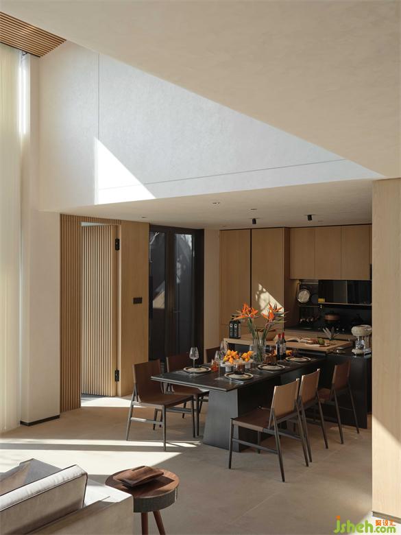 The dining room and kitchen are integrated into the design, making the kitchen no longer an isolated, enclosed space but combining the island counter and dining table to expand into a social venue for communication, sharing and banquet hosting, giving the space more complexity and possibility.