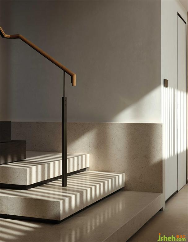 萬科樣板房設(shè)計會客廳后的樓梯向上延展,由溫潤的大理石踏面轉(zhuǎn)為質(zhì)樸的木飾面,行進之間疊級變化。