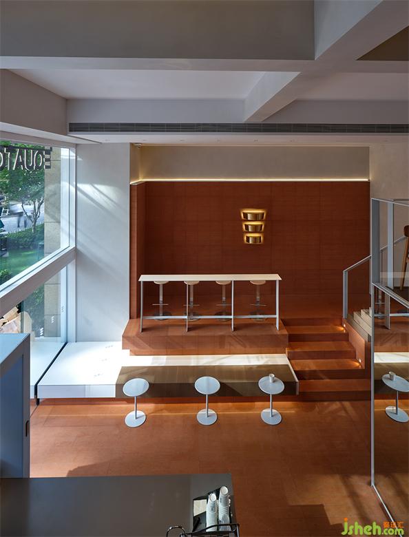 為了使咖啡廳的內(nèi)外溝通與延伸成為可能,并最大程度地實(shí)現(xiàn)由室內(nèi)向室外拓展的視覺效果,該COFFEE設(shè)計(jì)在材料的選擇和運(yùn)用上費(fèi)了一番功夫。