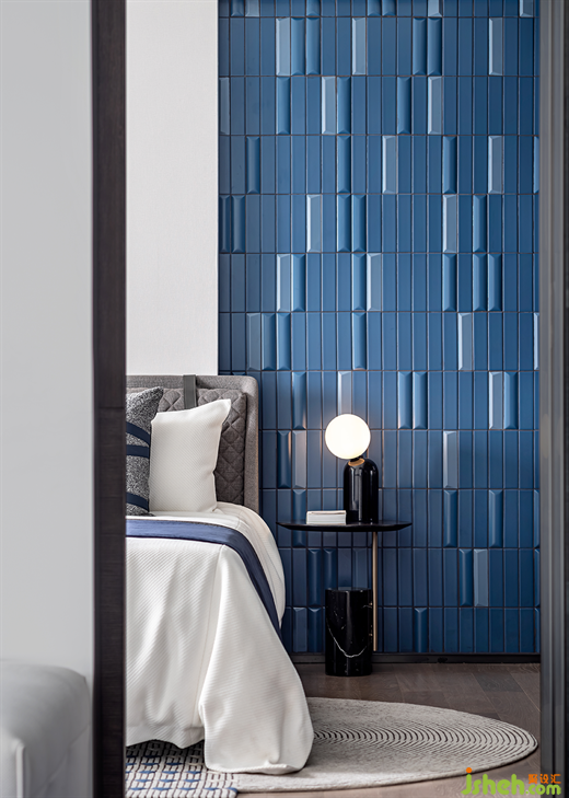 特別定制的藍色系床頭磚型背景材質延伸至浴室區(qū),彌漫著主人無處安放的藝術的追求,獨一無二卻又不顯突兀。