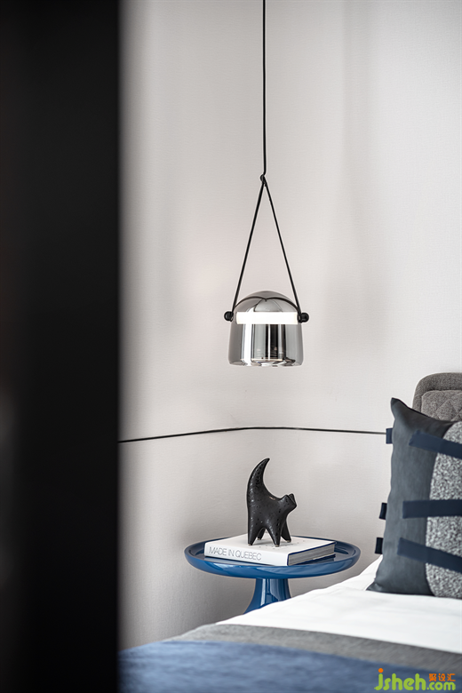 臥室延續(xù)了空間設計的整體性與一體化,比例和諧的藍白搭配又一次被完美詮釋。深圳樣板房設計現(xiàn)代金屬質感的精致吊燈,異形的黑色小雕塑,無一不展示著主人的極高的審美品味。