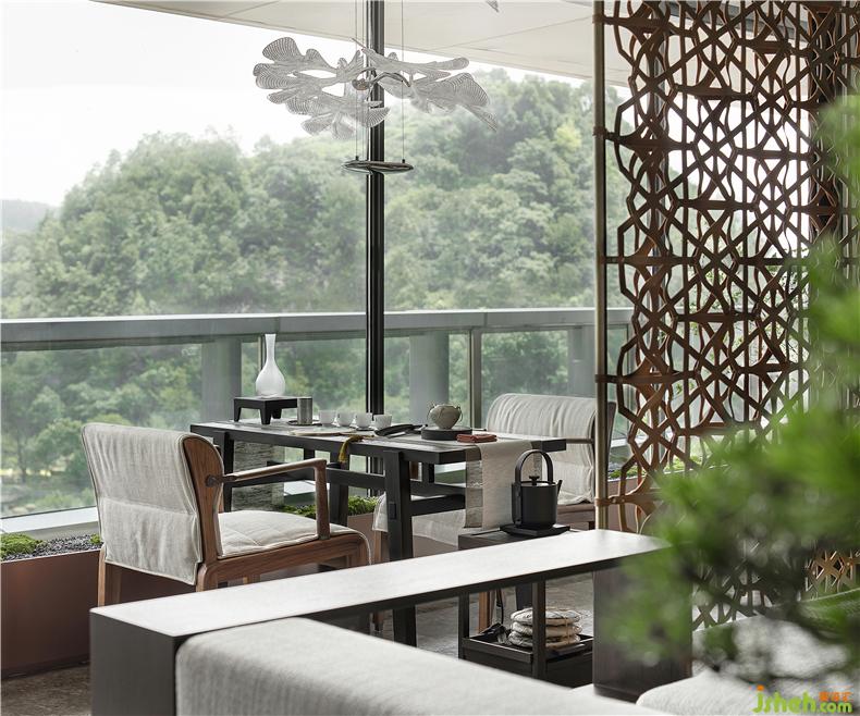 在客廳與陽臺開放相連處,有一扇藝術屏風,樣板房設計其靈感來自貴州當?shù)氐娜胫窬?。但設計師把筆鋒一轉,利用皮質材料構筑出這扇兼具藝術與時尚語匯的編織屏風,通過不同的材質回應了城市的地域特色。
