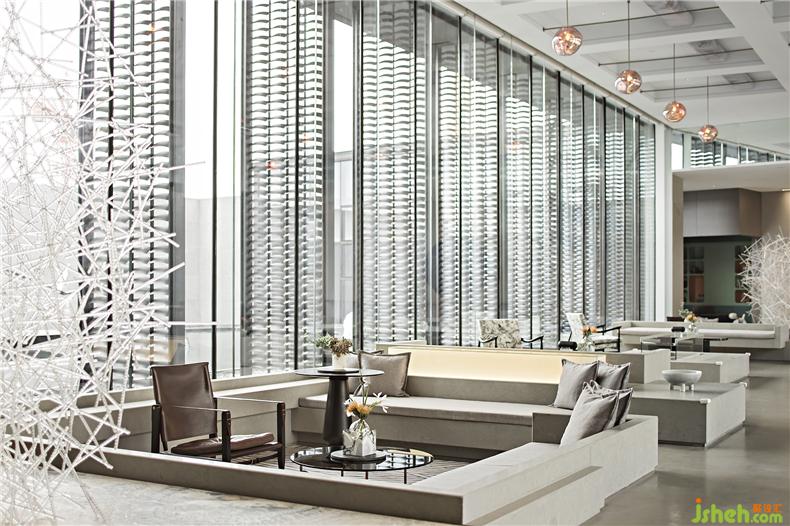 金屬、琉璃、石材巧妙組合運(yùn)用,勾畫(huà)出晶瑩剔透的意境。自然光線(xiàn)傾灑入室內(nèi),玻璃等通透的材料能與光線(xiàn)產(chǎn)生美妙的交互,明暗交錯(cuò)如水面漣漪反射的光影斑駁。大廳的設(shè)計(jì)過(guò)濾了來(lái)自于外界的繁復(fù),而液態(tài)的樹(shù)脂則凝固成想要的形狀,零星點(diǎn)綴在空間中。每一隅角落安置的藝術(shù)擺件都充滿(mǎn)巧妙的用意,空間立刻充盈無(wú)形的柔軟的力量,穿梭其中的訪(fǎng)客仿若能傾聽(tīng)到潺潺水聲。室內(nèi)設(shè)計(jì)師