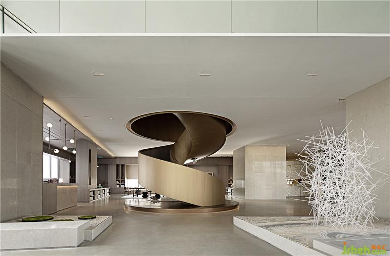 隨藝術(shù)導(dǎo)向行至?xí)涂臻g,大篇幅留白、灰色與木質(zhì)完美結(jié)合,點(diǎn)綴其中的傳統(tǒng)中國色彩盒子,以及玻璃裝置,皆如沉入一汪清淺池中。巨大的金屬螺旋樓梯的鮮明特質(zhì)在精心設(shè)計(jì)下顯得非常令人矚目,從上而下的流動(dòng)隱喻著相對(duì)的熱鬧,與身處的靜謐空間形成巧妙對(duì)比,相互矛盾卻又順勢而為。室內(nèi)設(shè)計(jì)師