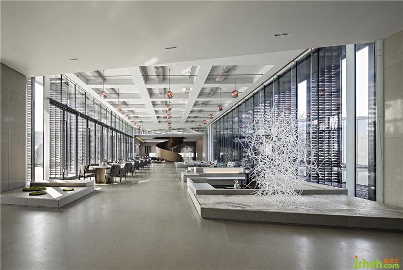 穿行而過沙盤區(qū)點(diǎn)綴在上空的水鳥裝飾,指引前路的走廊書墻,以及素雅靜謐的博學(xué)講堂,這些空間孕育著和諧柔美的氣韻,與窗外園中景色交相輝映,形成極盡東方韻味的復(fù)雜平衡。懸于半空的鳥形雕塑恰有百鳥歸巢之意,仿佛欣賞夠了窗外的美境,返回停息身心棲息之地。經(jīng)過博文講堂、書吧區(qū)域,走累了,可以靜享一本書,或是一杯茶的時(shí)間。陽光、清風(fēng)透窗而入,穿過古典裝飾屏風(fēng)。光停留在室內(nèi)的綠葉上,投下一片斑駁樹影,人在景中,景在畫中。