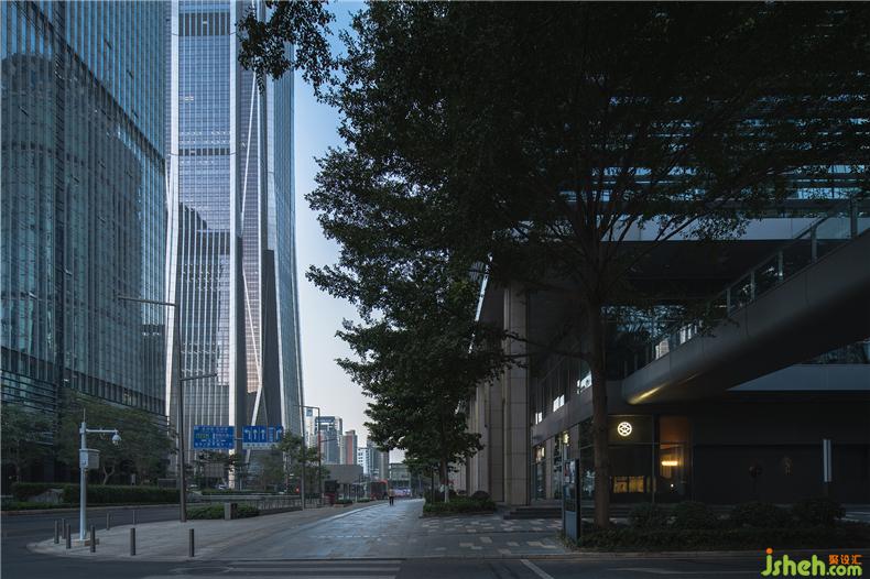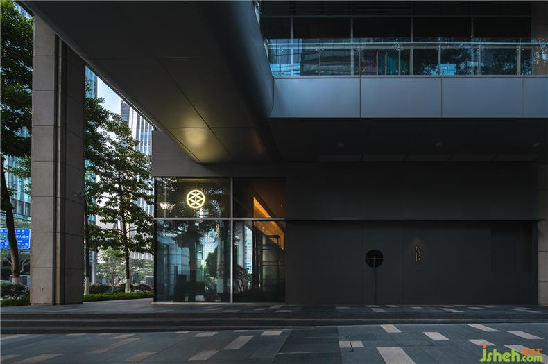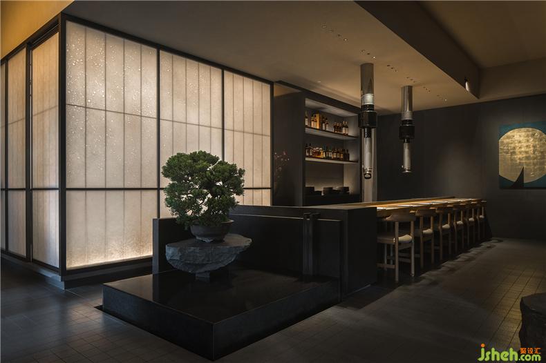華燈初上,宛如日本家徽圖案的“炎”字LOGO從門店臨街的玻璃門上映射出光環(huán),餐廳設(shè)計(jì)讓路過的人得以辨析這并非是無人之境;與倒映之上郁郁蔥蔥的疏影層疊,又平添幾分望不穿鋼筋水泥與自然綠意交織的神秘未來感。