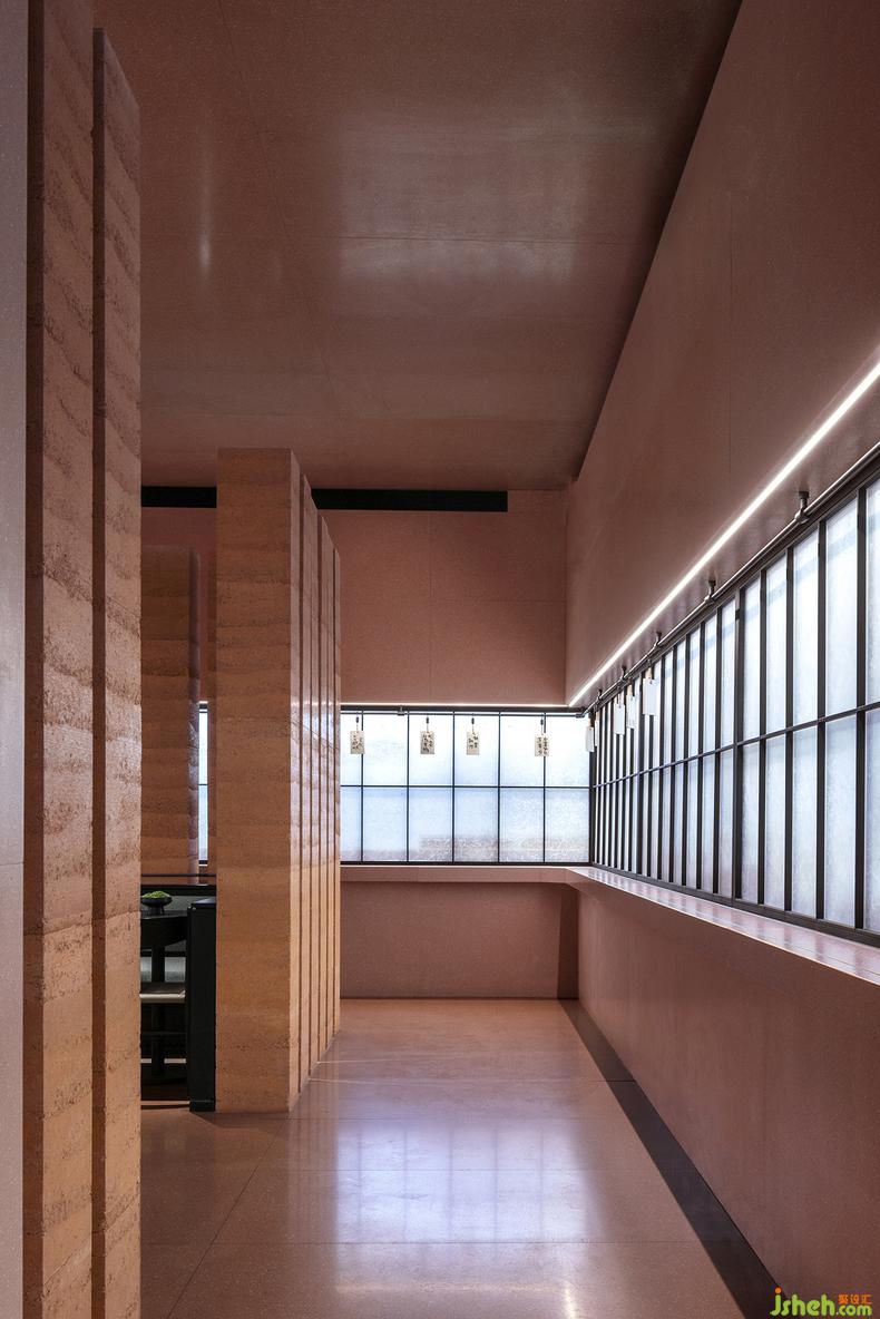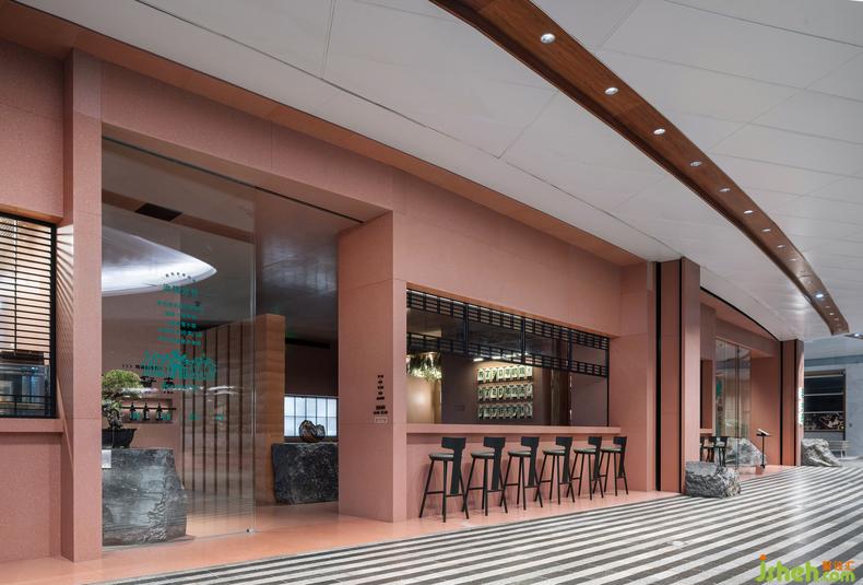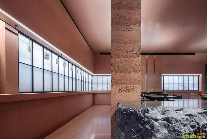 點餐處的玻璃窗上,亦隱現(xiàn)障子紙的天然紋路,經(jīng)過現(xiàn)代處理后可自動伸縮;餐廳設(shè)計懸掛其上的菜牌用毛筆書寫而成,于細(xì)微處又營造出時下逗趣的輕松感