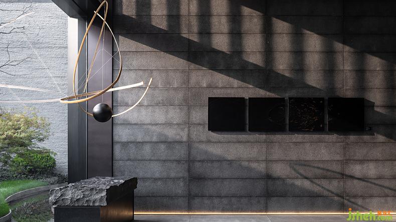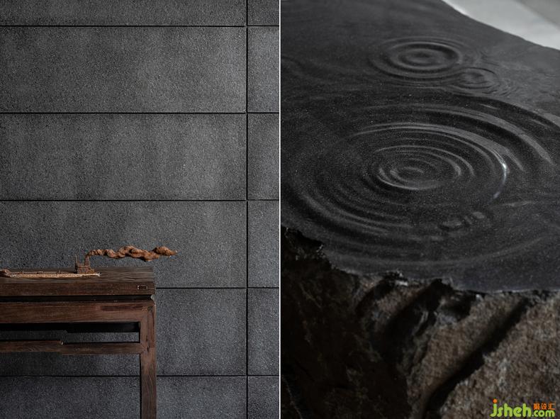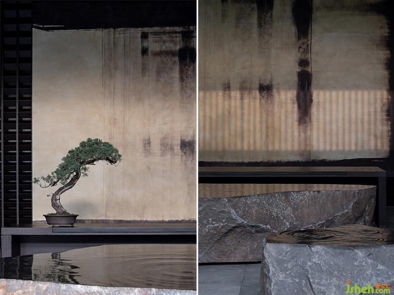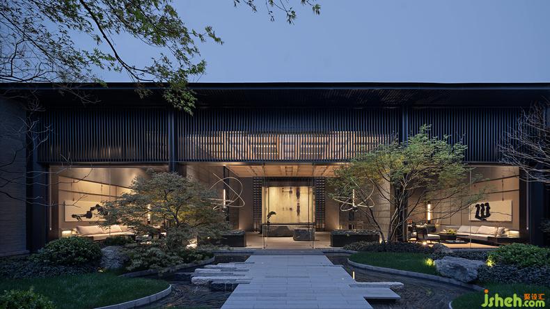 在這般滴翠的綠意中,掩映著一座與庭院共生的“閣子”,由深灰色格柵圍構(gòu)起的建筑去掉一切多余,被抽象為最簡(jiǎn)凈的線條和空間,摒棄矯飾反得一種純粹的哲思,這樣的空間精神也讓人自然生出返觀內(nèi)省的安靜。因?yàn)樾撵o下來(lái),感知與思考也被無(wú)限放大,于是使用透光障子的天花將自然光引化為“光陰的故事”——古人說(shuō)時(shí)間是光陰,這其中已然含有明暗交替的空間感。會(huì)所設(shè)計(jì)再加上庭院里通過(guò)格柵透入的自然光,這個(gè)空間竟然又將時(shí)間凝固了。身在其中,不論是靜立或徜徉,都如在閱讀歷史的詩(shī),觸摸當(dāng)代的云,浴沐湖面的風(fēng),是五感交織的神游。