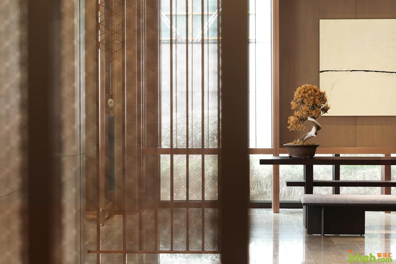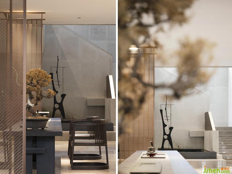 無處不在的鏤空屏風(fēng)與淺灰障屏,利用光影的游戲,在室內(nèi)構(gòu)筑出一方方東方式的朦朧幽玄的空間。一道道“屏風(fēng)”,遠(yuǎn)看似雅致的雕花槅扇,實(shí)則采用了金屬材質(zhì),在古典意境與當(dāng)代質(zhì)感之間玩味出時(shí)間的新韻。屏風(fēng)上有著豐富紋樣變化的網(wǎng)格與花格,放室外光線微明地滲入,銷售中心設(shè)計(jì)賦予空間中的畫作和藝術(shù)品以閑寂與深靜。而當(dāng)光與影的嬉戲隨著時(shí)間轉(zhuǎn)移,屏風(fēng)不動(dòng)聲色地對整個(gè)空間做出了更婉轉(zhuǎn)細(xì)致的區(qū)隔,帶來移步換景般的視覺體驗(yàn),也為《世說新語》中“從山陰道上行,山川自相映發(fā),使人應(yīng)接不暇”的名句,添上了幾分現(xiàn)代的注腳。