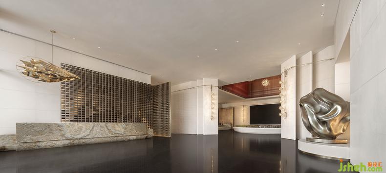 初步入,敞闊的接待前廳便以它的大尺度回應(yīng)了這片天地的朗然。金屬格柵式屏風(fēng)與米灰色天然石材的對(duì)撞,仿佛人工與自然、現(xiàn)代與傳統(tǒng)的勾連,而一盞“日不落”式裝置的加入,則與這里遲遲不肯落幕的太陽(yáng)相互輝映,如同永不墜落的生命之光,用藝術(shù)點(diǎn)亮了整個(gè)空間。生活館設(shè)計(jì)而另一側(cè)存在感顯著的空間雕塑則汲靈感自大風(fēng)吹皺的綢緞動(dòng)態(tài),不正是千年前絲路上的美妙一瞬。