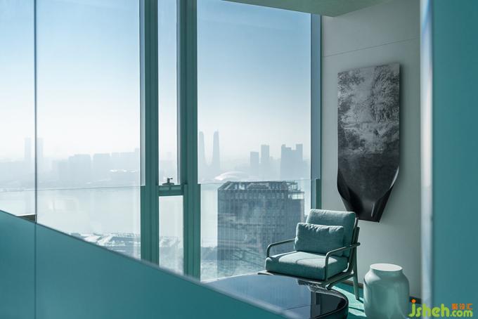 《釋名》說“青,生也,象物生時(shí)色也”。作為東方正色的“青”,蘊(yùn)涵著萬物萌發(fā)的無限生機(jī)。杭州餐廳設(shè)計(jì)不同明度和色階的青色如水彩般濡濕、浸透、調(diào)和于空間體塊和家具系統(tǒng)中,由外及里構(gòu)成天成地接的階梯式遞進(jìn)氛圍。動(dòng)線中視覺落點(diǎn)的裝置器物,則以抽象重疊的褶皺與紋理勾勒細(xì)部精微之美,鏡面的穿插運(yùn)用亦帶來視錯(cuò)觀照的多重意趣