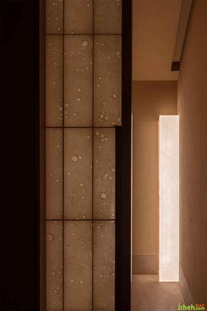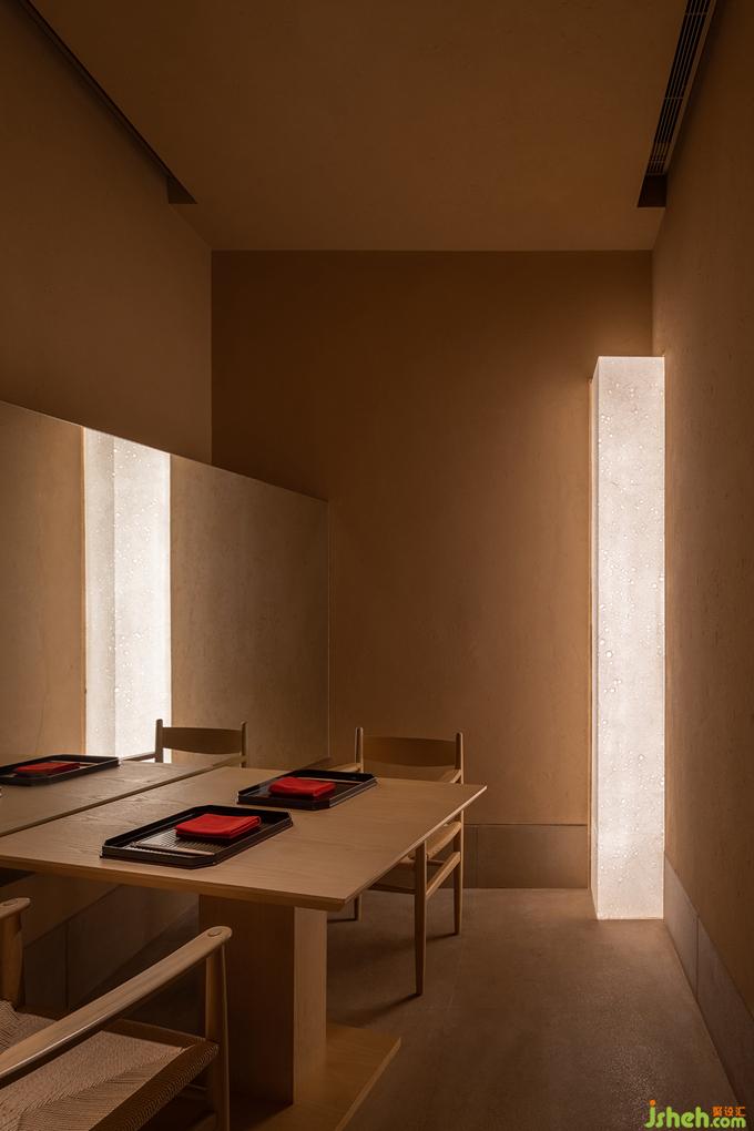 日本料理設(shè)計用光的克制也如繪畫的留白,廊道里只剩下微弱的光線指引著方向,餐廳設(shè)計駐足停留之處便任由光線透過和紙柔和地暈開,遠近高低,變換著點、線、面的形態(tài),實驗性地試探著人與物的關(guān)系。