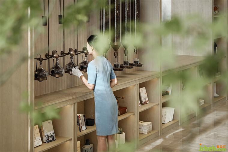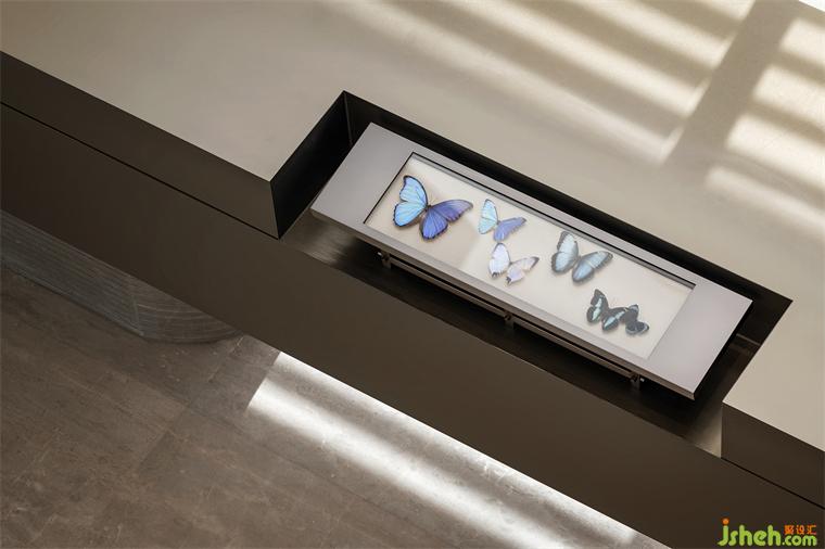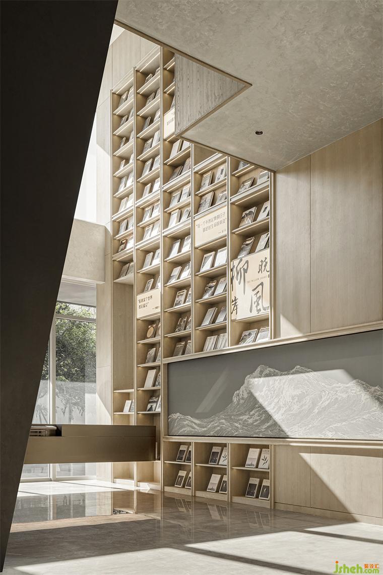 徜徉在昆明綠城&德潤(rùn)柳岸曉風(fēng)生活館中,一種“城市之中,游林之外”的意趣伴隨始終。入口處的接待區(qū),收束的空間起到了引入的作用,這里閑雅寧和的木色調(diào)與中性色調(diào)在金屬、石材和木材的協(xié)奏中表達(dá)了整個(gè)設(shè)計(jì)的主題——書香趣游。靈活的建筑體塊將挑高充裕的空間進(jìn)行了得宜且活潑的排布調(diào)動(dòng),在圖書館式的高闊書墻背景下,室內(nèi)設(shè)計(jì)師甚至形成了一、二層的動(dòng)線互文。至于書墻上那幅如手卷般橫向展開的藝術(shù)畫作則進(jìn)一步勾起“游人”的好奇,引人“緣溪行”,繼而忘路之遠(yuǎn)近。