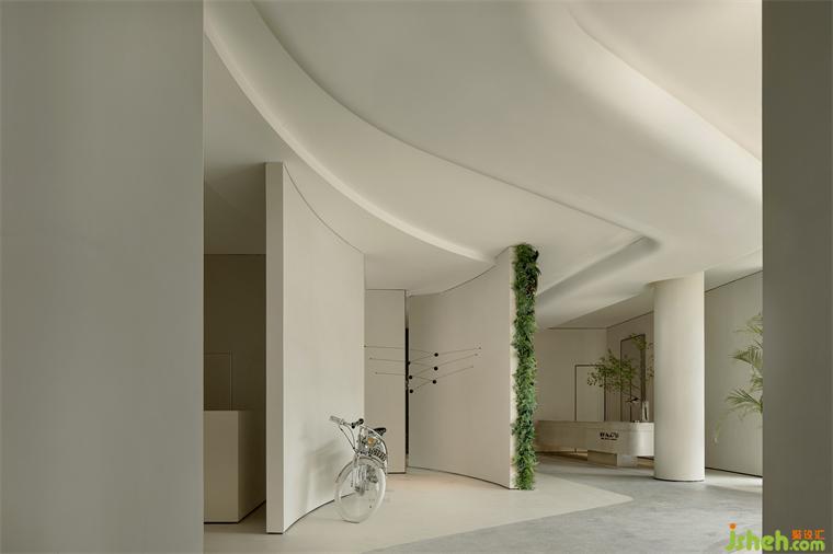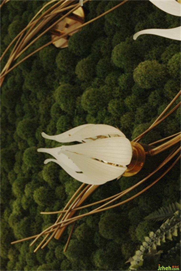兩面花藝肌理的綠植墻,語調(diào)清新,青苔、花朵、室內(nèi)設計師和林間散步的小鹿,皆以藝術化的表現(xiàn)形式成為空間的一部分,呼應了所處的自然溪谷絕妙的自然氛圍,成為了空間的主導。