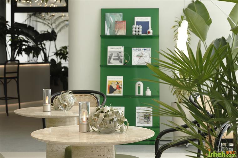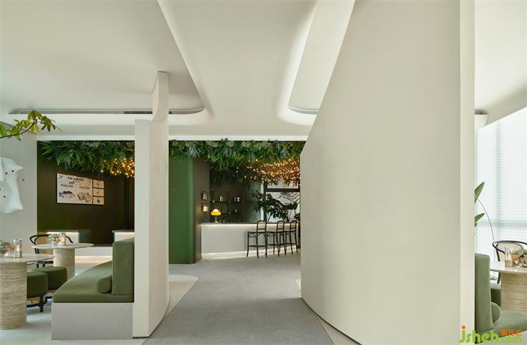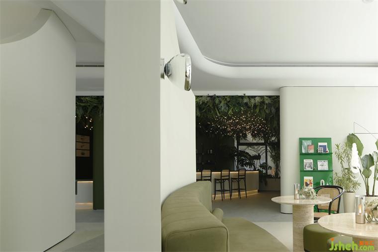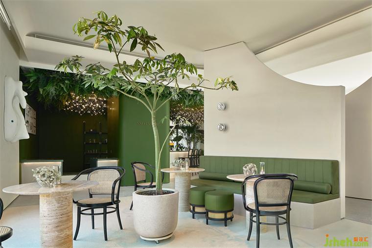 從天花如瀑布傾瀉而下的綠意,室內(nèi)設(shè)計(jì)師配合著交織、閃爍的藝術(shù)燈飾,像點(diǎn)點(diǎn)星光般、像流螢飛舞般,成為水吧區(qū)沉浸式花園體驗(yàn)的重點(diǎn)表達(dá)。