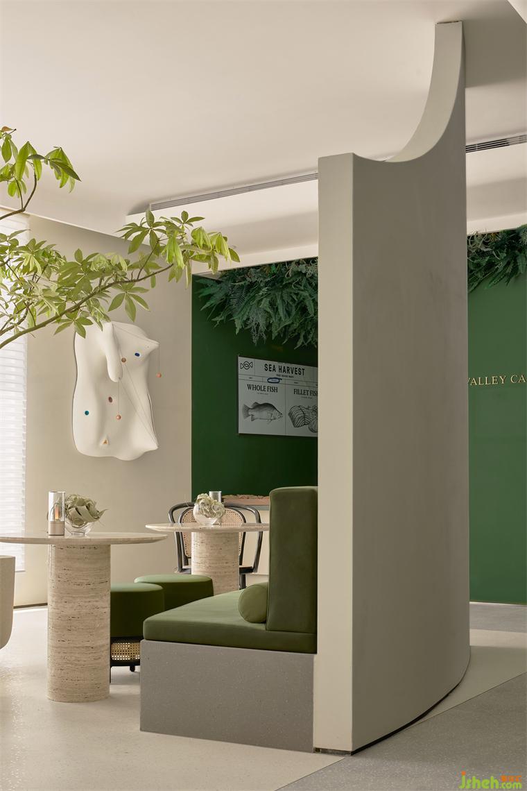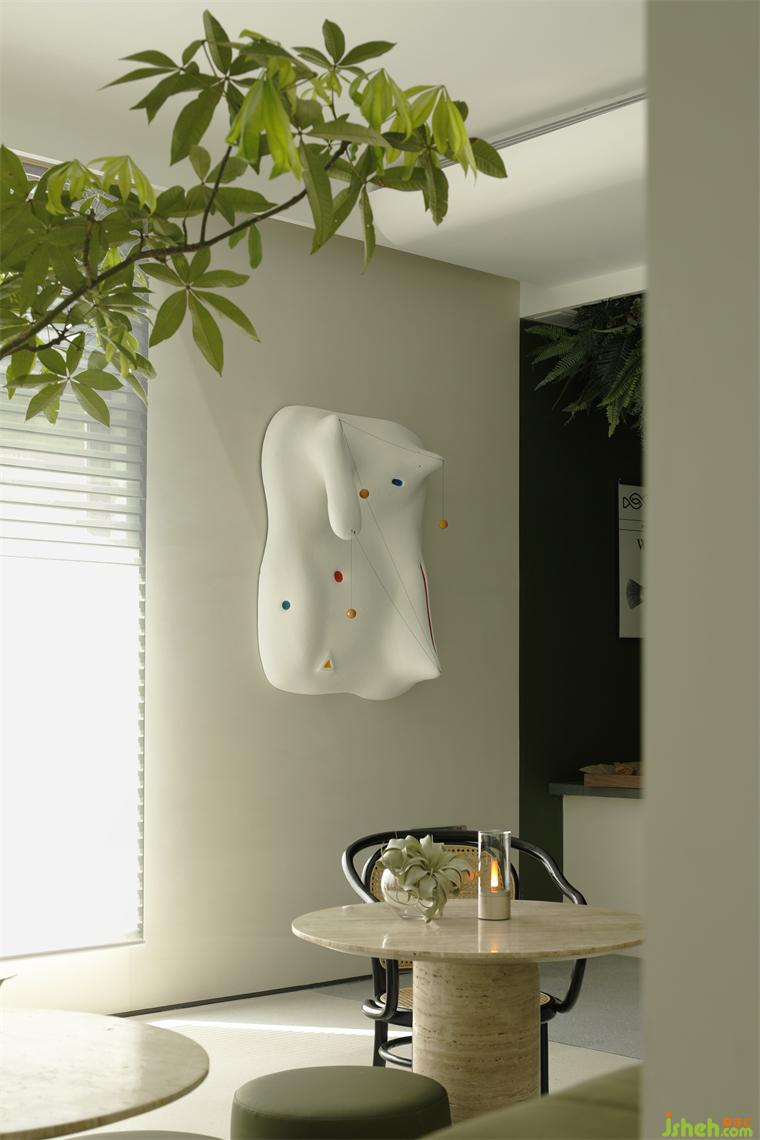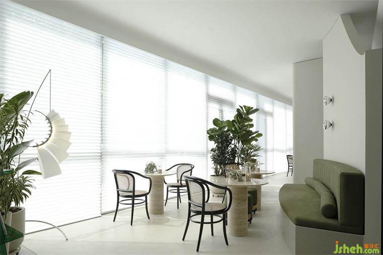 一層的餐廳以“花嶼”為主題, 室內(nèi)設(shè)計師整面數(shù)字花園的智能裝置,為原本安靜、平緩的空間,注入了流動感。暗黑背景的電子屏幕上,花開花謝變得轉(zhuǎn)瞬即逝,映生一種獨特的“室內(nèi)景觀”。
