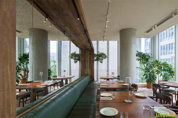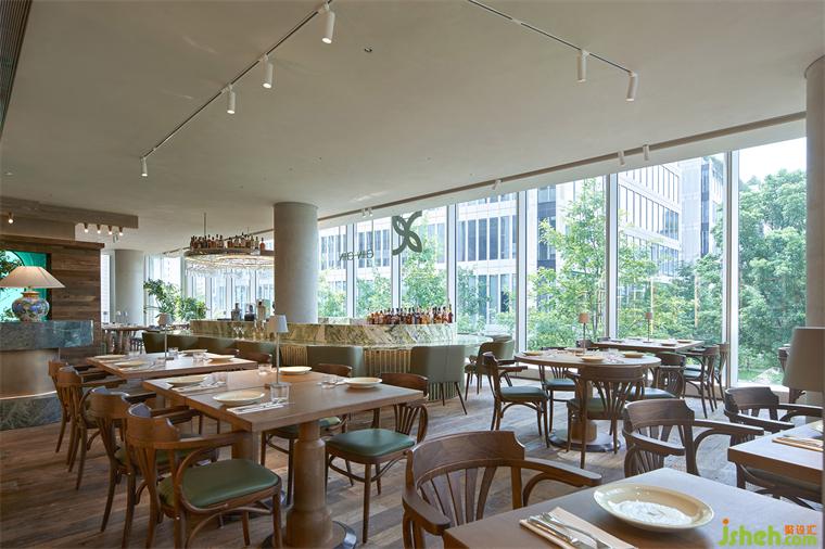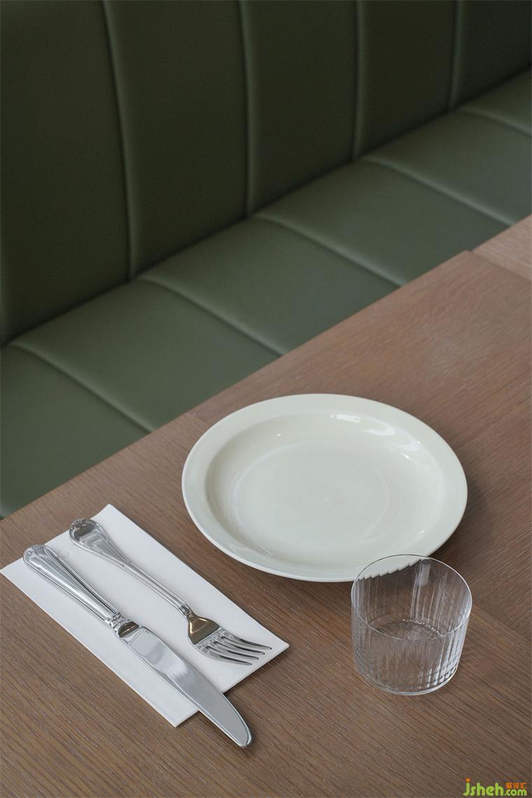 翡翠綠大理石紋理如甜點(diǎn)般質(zhì)感,搭配以綠色橡木紋理材質(zhì),餐廳設(shè)計(jì)整體以一種優(yōu)雅的姿態(tài),在餐廳入口的不遠(yuǎn)處,靜候客人的到來(lái)。