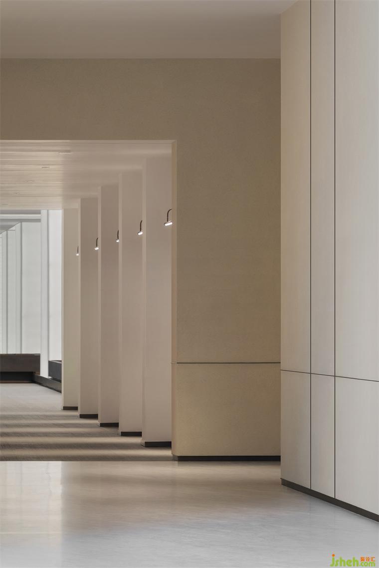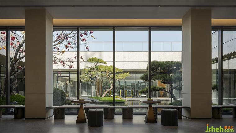 深度洽談區(qū)依中央庭院鋪展開來,猶如展開一幅充滿書香的手卷,大有幽澗隨人之感。深木色與石黑、淺卡其色共同營造出沉穩(wěn)的安定感,伴著書架上與城市記憶和人文藝術(shù)相關(guān)的書籍,裝修設(shè)計以及藝術(shù)感十足又不過分夸張的家具,讓人心下沉靜。而對面玻璃墻外的庭院水景在提供充足自然光的同時,也如有生命的畫面在眼前流動,為整個空間帶入盎然生趣。