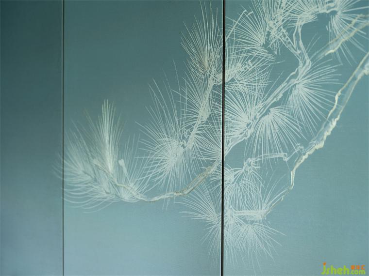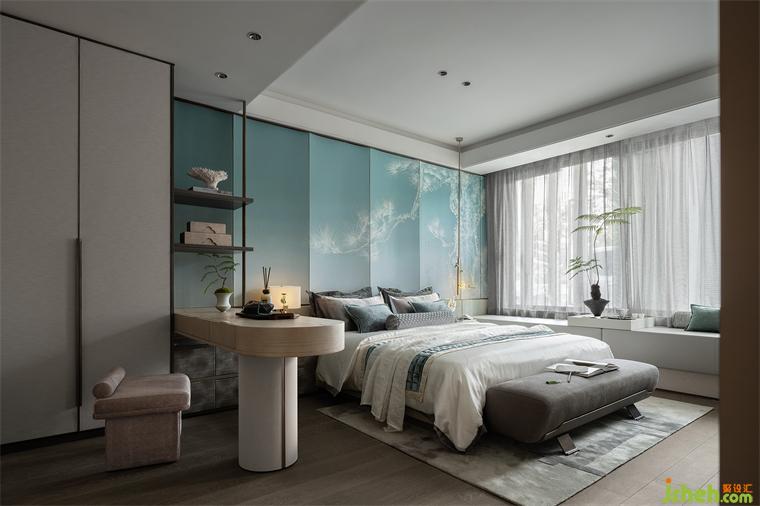 床頭墻壁以寧靜的藍(lán)色風(fēng)帆裝飾,描以古松。