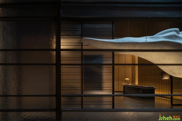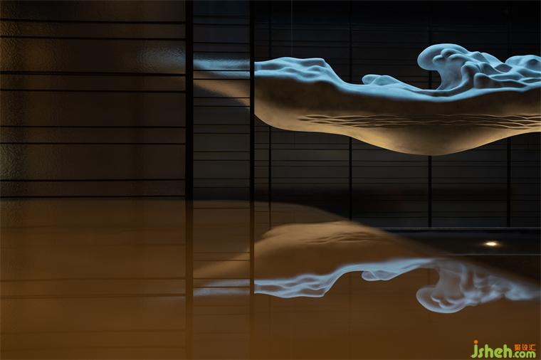 云與浪幻化為船只的形態(tài),含蓄巧妙的對(duì)雕塑本體施以靜謐的負(fù)形水紋,就像船只行駛在水面上,由水面的波光反射到船身處。以間接的表達(dá)來襯托船只在水面上前行,詩意而浪漫。裝修設(shè)計(jì)負(fù)形手法的水紋,在陰陽的變幻之間更彰顯著東方的文化韻味。