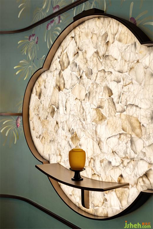 售樓處設(shè)計(jì)以工筆花朵鋪陳墻面,設(shè)色淡雅,清雅脫俗。尤其日光斜照,花影綽綽,仿佛置身于花叢中,令人低徊不已。