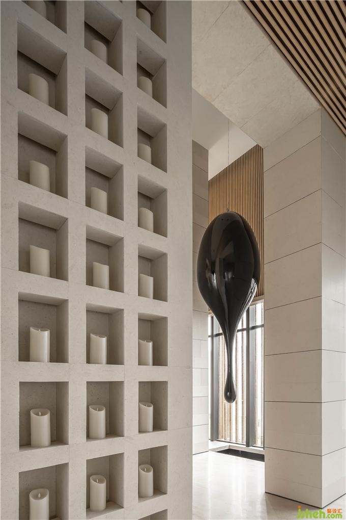 黑色的巨大藝術(shù)雕塑,肅穆而莊嚴(yán),仿佛洞悉著世間萬物輪回的艱辛與沉苦。一墻的半透光景,再點(diǎn)亮萬壑燭光,讓氣闊的空間,多了更多的人生故事與縹緲的視覺氛圍。