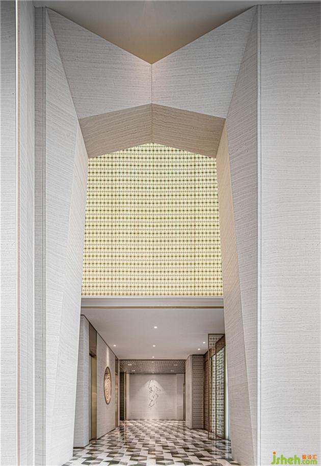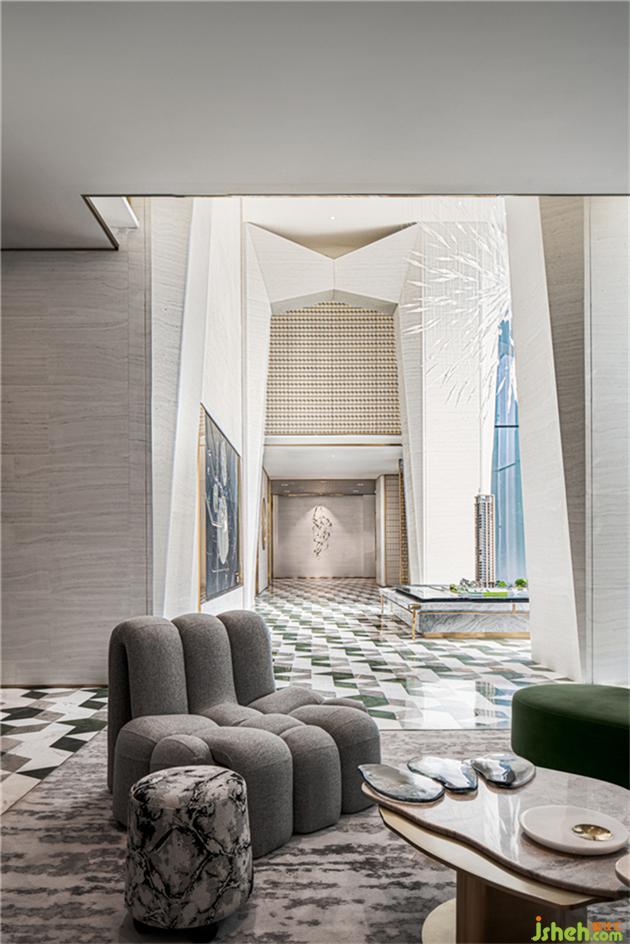 背景通過藝術(shù)品呈現(xiàn)與石材的層次感增強(qiáng)空間的藝術(shù)品位,設(shè)計師通透的金屬屏風(fēng)作為大堂空間分割,使大廳與接待區(qū),兩者看似一體卻又互不干擾,透過燈光折射,仿佛在玩一場光影游戲,干凈剔透又饒富幻變魅力。售樓處設(shè)計