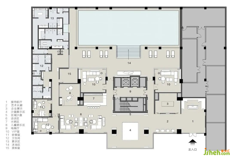 泳池區(qū)與vip室之間的玻璃隔斷不僅契合了空間寶盒的主題,同時讓VIP室與外界相連 ,與泳池產(chǎn)生了互動,悠悠水波與光影增強了空間深邃氛圍,營造一種尊貴不凡的藝術(shù)體驗。
