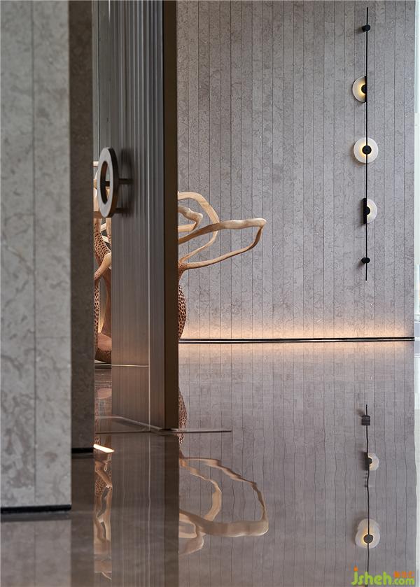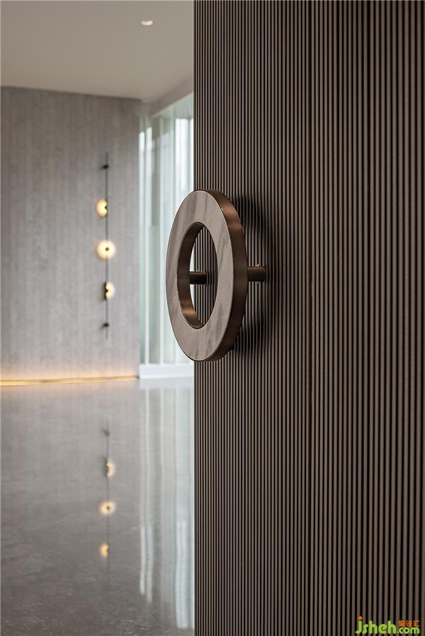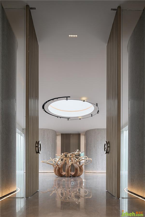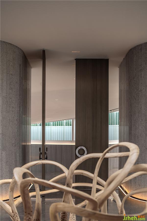 門廳作為入戶的門面,挑高設(shè)計(jì)呈現(xiàn)出天門中斷楚江開(kāi)的磅礡氣勢(shì)。設(shè)計(jì)師透過(guò)圓弧壁面引導(dǎo)動(dòng)線,柳暗花明后進(jìn)入充滿開(kāi)放感的室內(nèi)空間,創(chuàng)造豁然開(kāi)朗的視覺(jué)效果,同時(shí)也反映武漢匯納百川的江湖氣蘊(yùn)。會(huì)所設(shè)計(jì)
