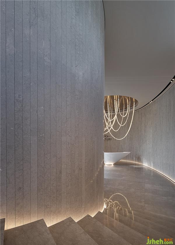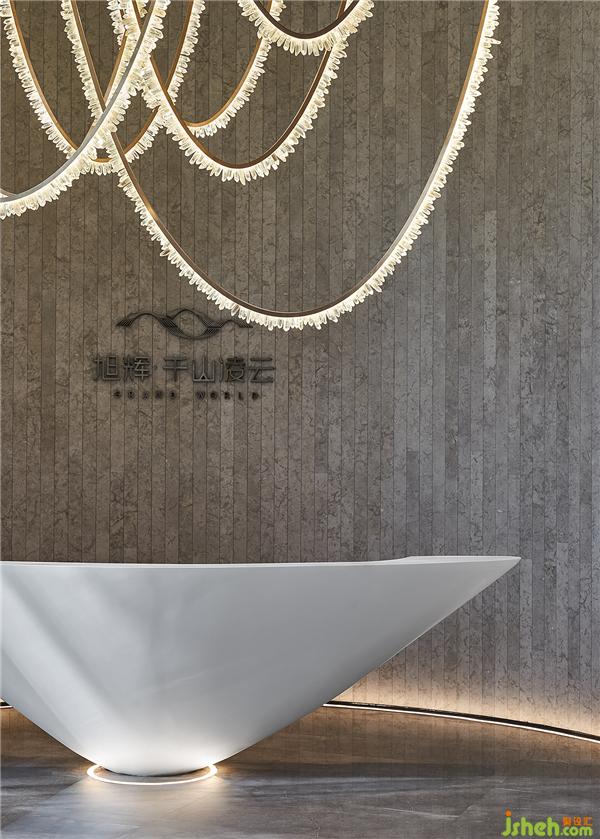 銷控接待臺前,水晶金屬藝術(shù)吊燈勾勒出立體造型,其靈感來自江河水流的曼妙曲線,弧線與弧線彼此串聯(lián)交織,仿彿激蕩飛濺的水花,視覺震撼放大每一位來訪者的感官情緒,將所處空間與自然、人文連結(jié)起來。會所設(shè)計
