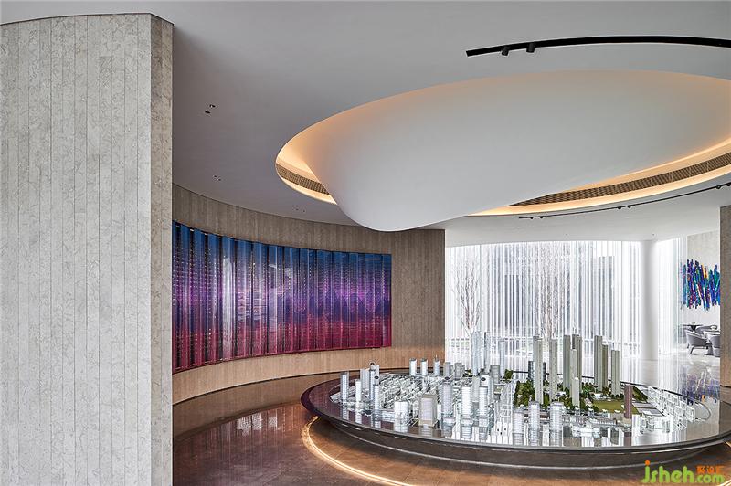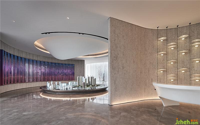 中心沙盤區(qū)同樣以藝術(shù)佐景,波濤洶涌的抽象江水映襯著未來的都市雛形,在圓融和諧的空間設(shè)計中,隱隱呼應(yīng)著魚躍龍門、奔流騰達的壯志豪情和都市精英積極躍然的生命姿態(tài)。
