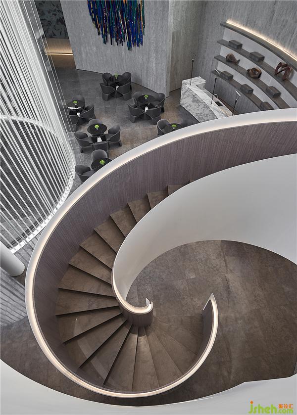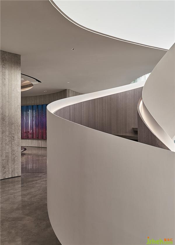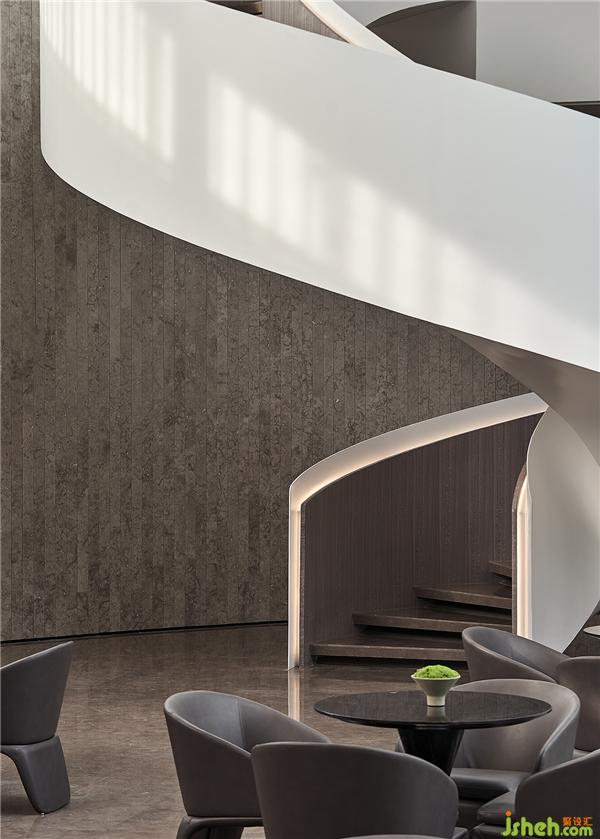 接待區(qū)與水吧區(qū)采用開放式景觀樓梯設(shè)計,令人聯(lián)想到水中漩渦,賦予一種圓融、綿延、源源不絕的視覺感受。地磚光澤與墻面相互輝映,去除不必要的陳設(shè)擾動空間通透性,陽光與微風(fēng)自然充盈整個空間。會所設(shè)計