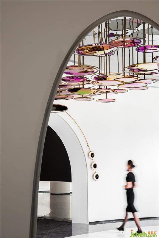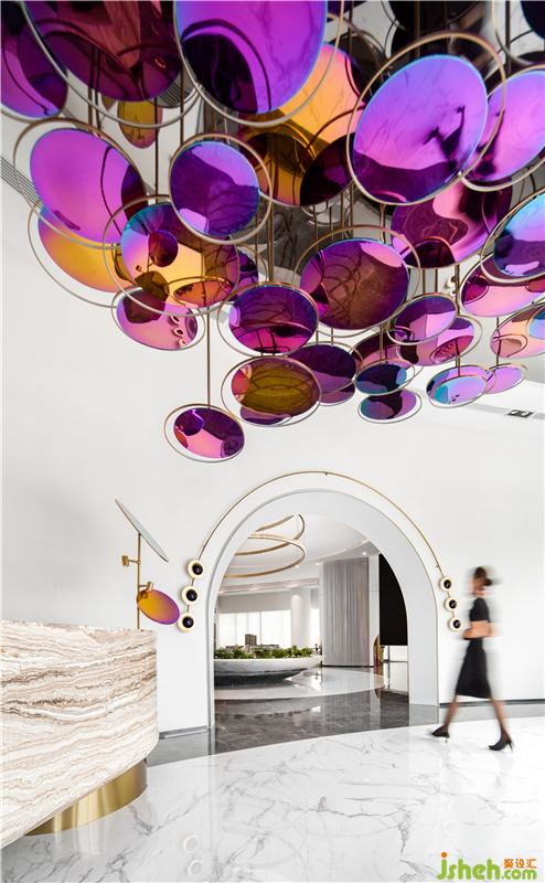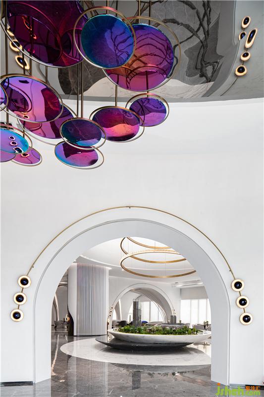 隨處可見的圓環(huán)與弧線,為凝固的空間注入了流動與韻律。像是從屋頂葳蕤生長出來的彩色荷葉,金屬鏡面互相倒影,影影綽綽。絢麗的藍紫色,稀釋了以白色為主調(diào)的前場區(qū)室內(nèi)環(huán)境所帶來的冷清感,而著上了些許夢幻情調(diào)。