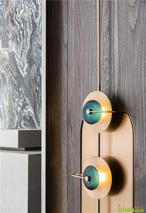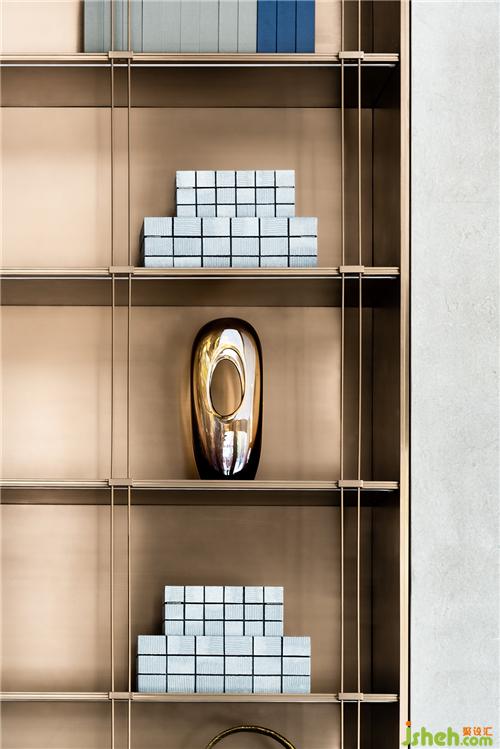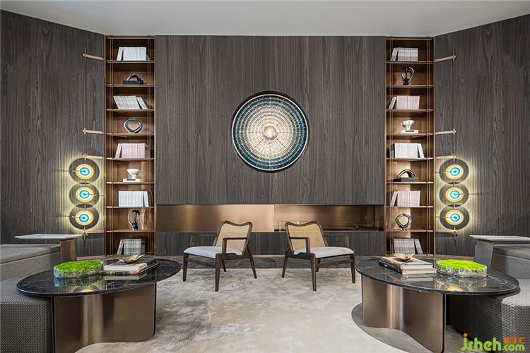 圓形玻璃壁燈的浮雕肌理、高柜上的藝術(shù)擺件……WJID使不同質(zhì)感相互點(diǎn)綴,打造出古樸與現(xiàn)代的結(jié)合。圓形壁燈柔和了原本規(guī)整的縱向線條,為洽談區(qū)增添了一絲婉轉(zhuǎn)。綠色玻璃及古銅金屬作為點(diǎn)綴,使空間層次更加富有意蘊(yùn)。裝修設(shè)計(jì)