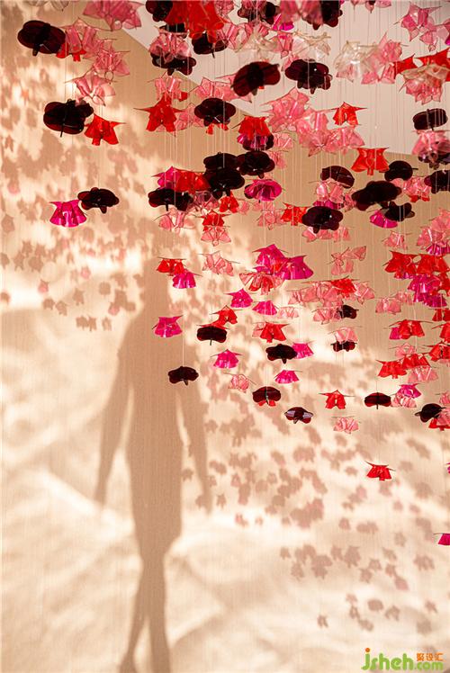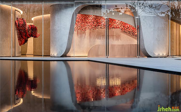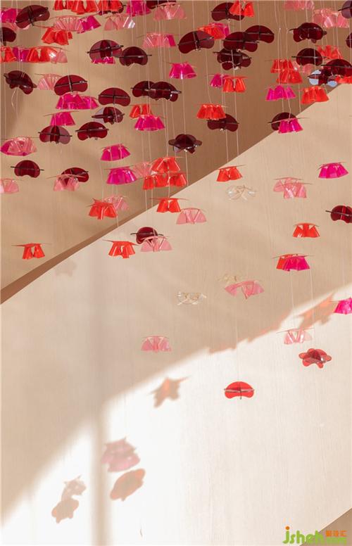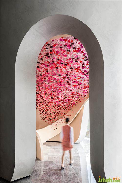 顏色富有層次感的半透明花瓣自頂面垂吊、擁簇,漫天飄灑,輕盈柔軟,閃動著生命的靈動與嫵媚。在自然光的渲染下,開出一片不敗的花海,繁花的豐盈療愈著雙眼。移步換景間,還仿佛能嗅聞到山茶雅致的清香。裝修設(shè)計(jì)