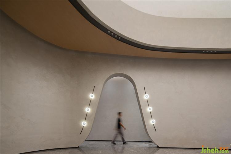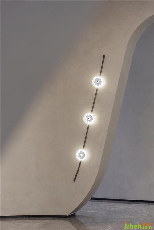 設(shè)計師借鑒現(xiàn)代美術(shù)館的設(shè)計手法,通過點、線、面的交錯與構(gòu)成來表達空間的形態(tài)。圓形壁燈如明珠懸于墻上,與線條流暢的拱門與安謐的灰色墻面相襯,為整個空間籠罩了一層柔潤的光澤。