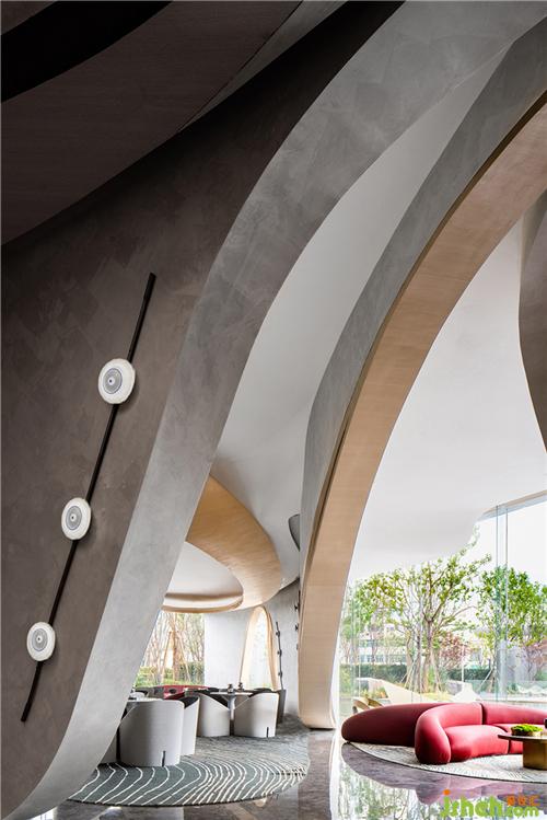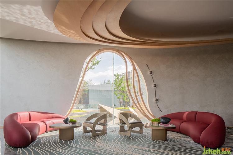 沙發(fā)區(qū)與洽談區(qū)之間以塊毯來劃分界限,半開半合,讓開敞的交談漸漸轉(zhuǎn)入舒緩的節(jié)奏。大范圍使用落地窗,通透的格局模糊了室內(nèi)外邊界,打造出親近自然、富有溫度的美學(xué)社區(qū)。