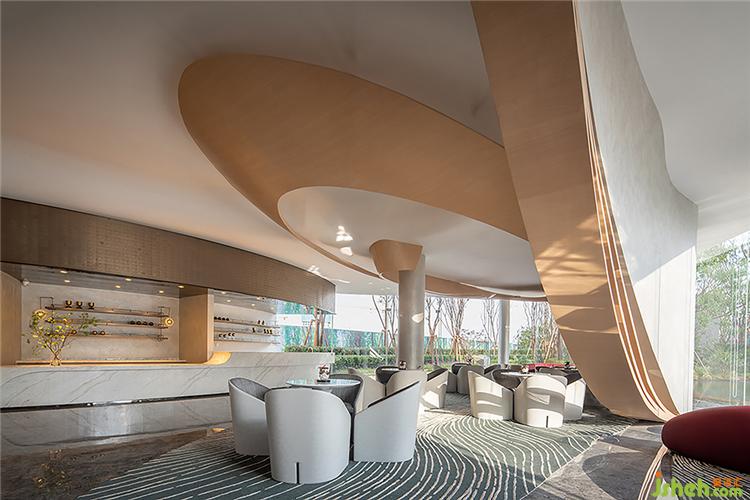 幾經(jīng)流轉(zhuǎn),景色豁然開朗,視野延伸至更開闊的境地,觀者在此完成心境的轉(zhuǎn)換。洽談區(qū)頂端延續(xù)沙盤區(qū)的手法,增添了板材的使用。