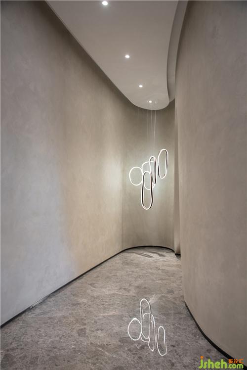WJID提取硬裝空間的形態(tài)元素,在藝術(shù)長廊盡頭形成垂掛式的藝術(shù)裝置,迎著光與花蜿蜒在墻面,如同城市線條的縮影。