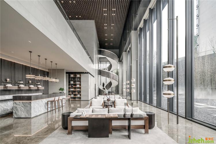旋轉樓梯如一座極具美感的雕塑,優(yōu)雅的弧形設計給平鋪直敘中增添了韻律,賦予了前廳靈魂。具有當代性的金屬材質在樓梯的運用中,生出了溫潤的東方氣質。