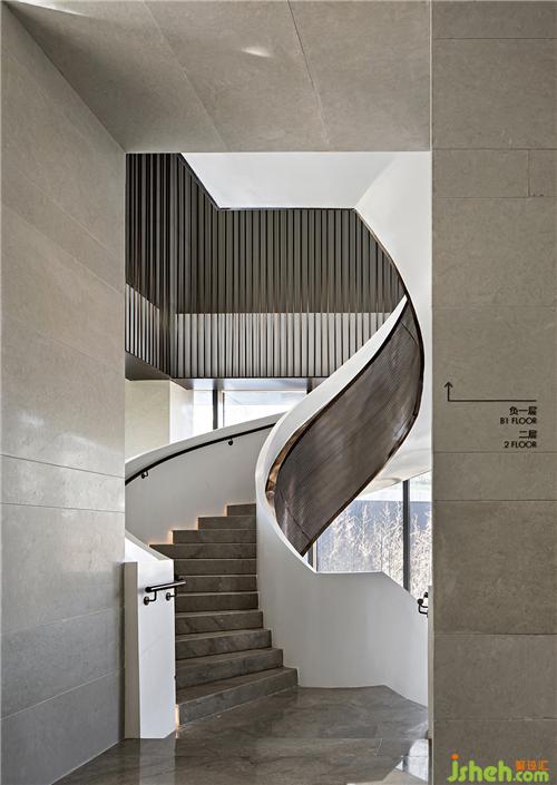 不同視角下,樓梯的線性之美盡顯無(wú)疑。影影綽綽中,猶如山間小徑蜿蜒而下,似動(dòng)非動(dòng),安然而飄逸。