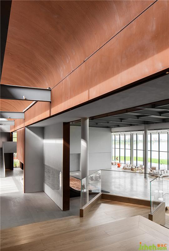 空間的色彩關系在簡潔的形體中顯得更為突出。深色的橫梁與暖色的弧形天花形成了色彩的對撞,創(chuàng)造出了一個寧靜而厚重的室內(nèi)裝修設計空間。