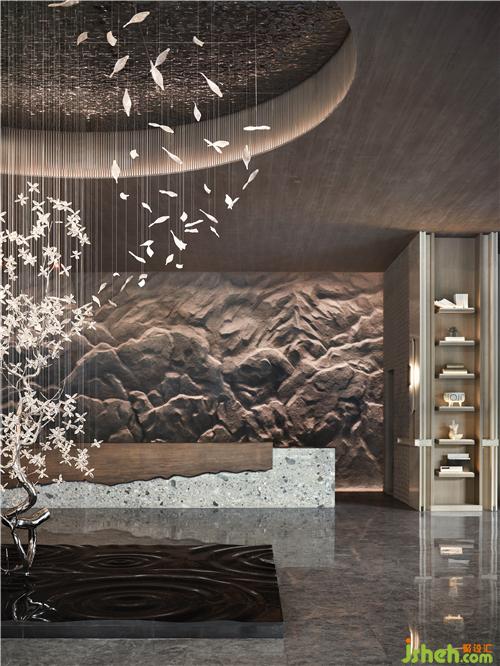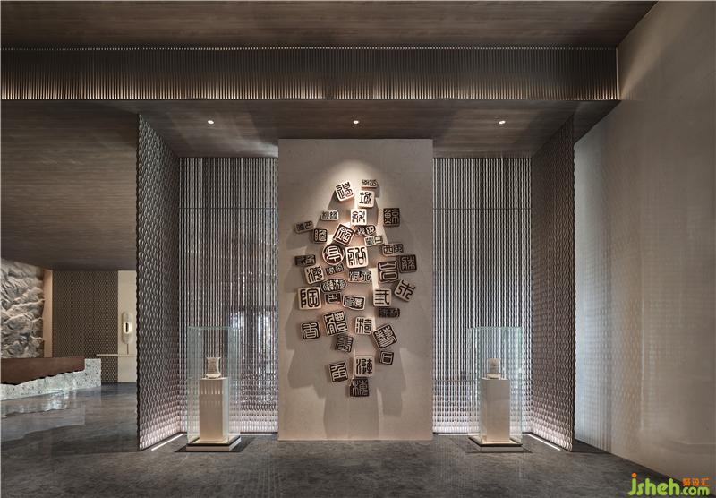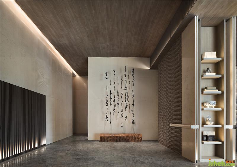 文字元素的「古」與現(xiàn)代技法的「今」相互碰撞交融,極簡(jiǎn)空間因?yàn)閹仔醒笱鬄⒌拇笞指眵攘Γ蟮厣祻浡灤┯谡w空間之中,如身臨山石真境,使人感受舒適、安寧。