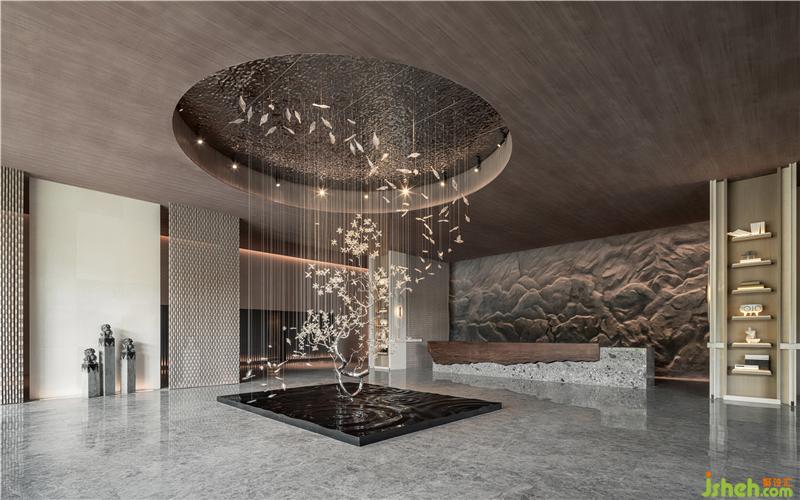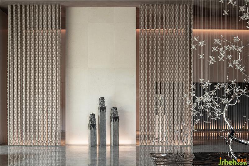 石獅陣肅穆、莊重,金屬現(xiàn)代感墻面以縱向線條依次排列,上海售樓處設(shè)計(jì)玩味出空間儀式感,讓人體味溫馨、細(xì)膩的空間情緒。